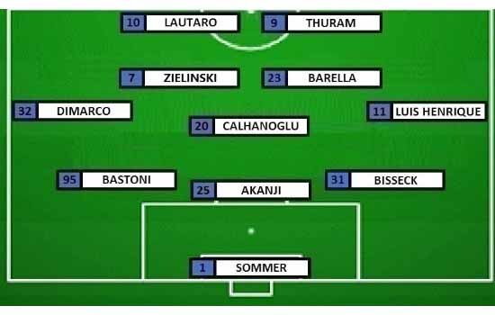 INTER MILAN (3-5-2): Sommer; Bisseck, Akanji, Bastoni; Luis Henrique, Barella, Calhanoglu, Zielinski, Dimarco; Thuram, Lautaro.