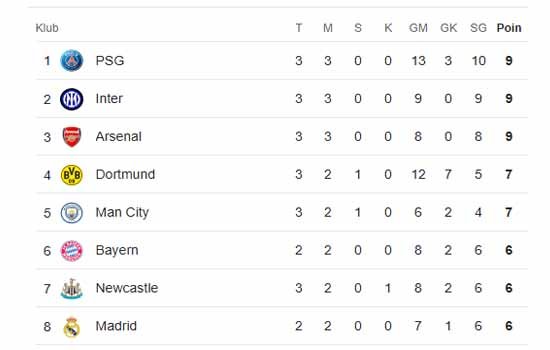 Klasemen Sementara Liga Champions (Top 5 dari 36 Tim)
