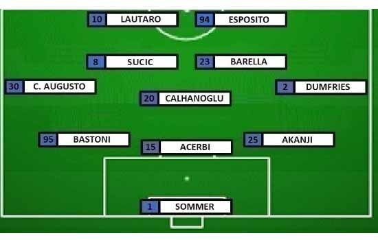 INTER (3-5-2): Sommer; Akanji, Acerbi, Bastoni; Dumfries, Barella, Calhanoglu, Sucic, Carlos Augusto; Pio Esposito, Lautaro.