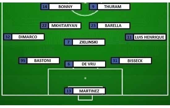 INTER (3-5-2): J.Martinez; Bisseck, De Vrij, Bastoni; Luis Henrique, Barella, Zielinski, Mkhitaryan, Dimarco; Thuram, Bonny.