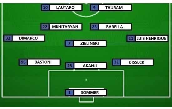 INTER MILAN (3-5-2): Sommer; Bisseck, Akanji, Bastoni; Luis Henrique, Barella, Zielinski, Mkhitaryan, Dimarco; Thuram, Lautaro.