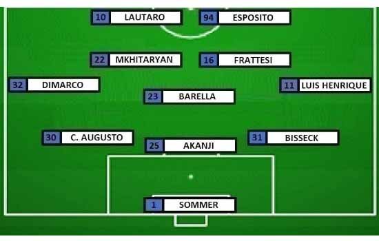 INTER (3-5-2): Sommer; Bisseck, Akanji, Carlos Augusto; Luis Henrique, Frattesi, Barella, Mkhitaryan, Dimarco; Esposito, Lautaro.